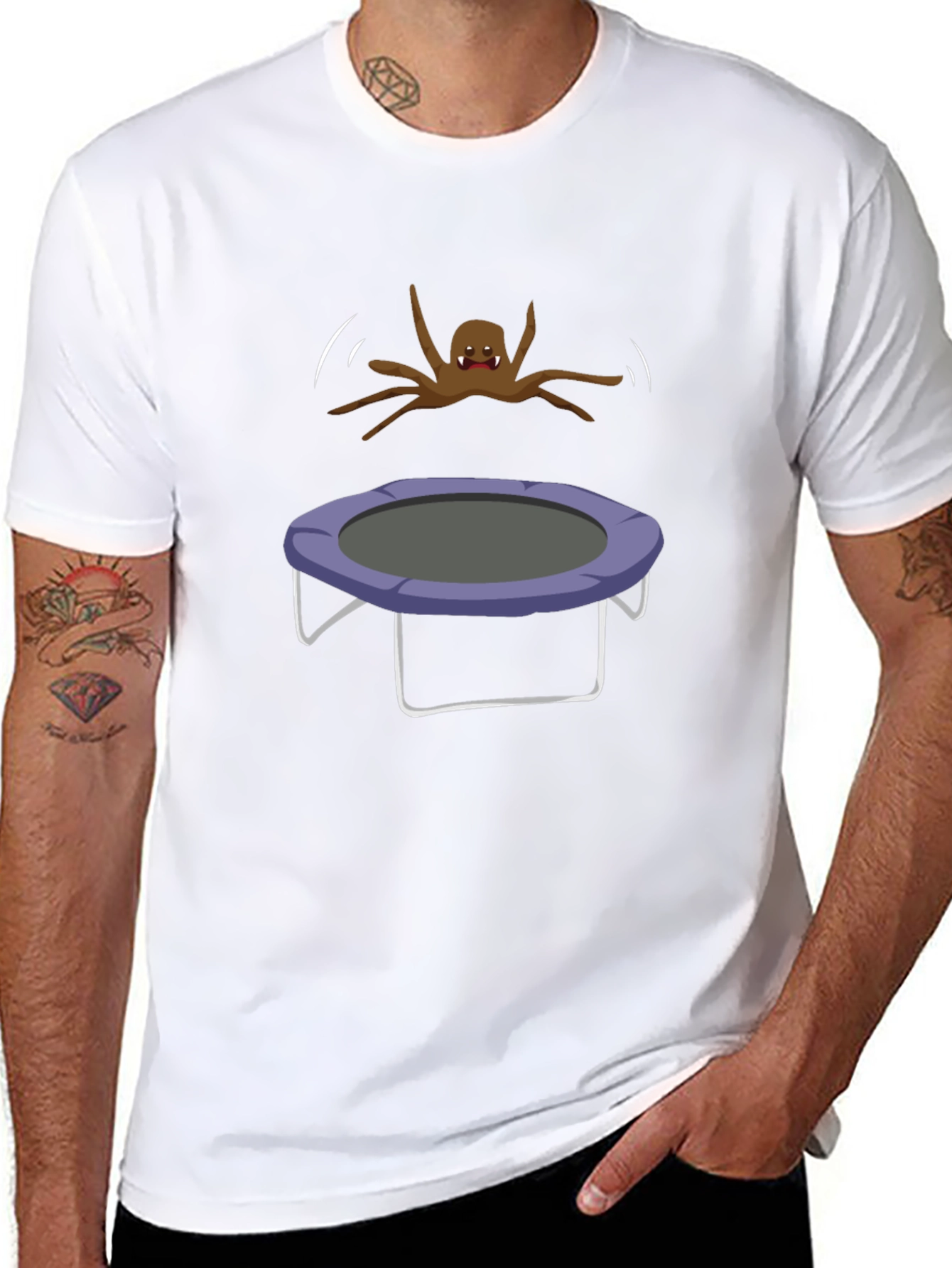 This playful black t-shirt features a whimsical cartoon design of a brown spider jumping on a purple trampoline. The graphic offers a humorous and lighthearted appeal, making it a fun addition to your casual wardrobe. Made from a comfortable-looking fabric, this tee appears breathable and suitable for everyday wear. The shirt's design is perfect for those with a quirky sense of humor or fans of unique graphic tees. Wear it to casual outings, relaxed gatherings, or simply as a conversation starter. This t-shirt blends comfort and quirky style seamlessly.