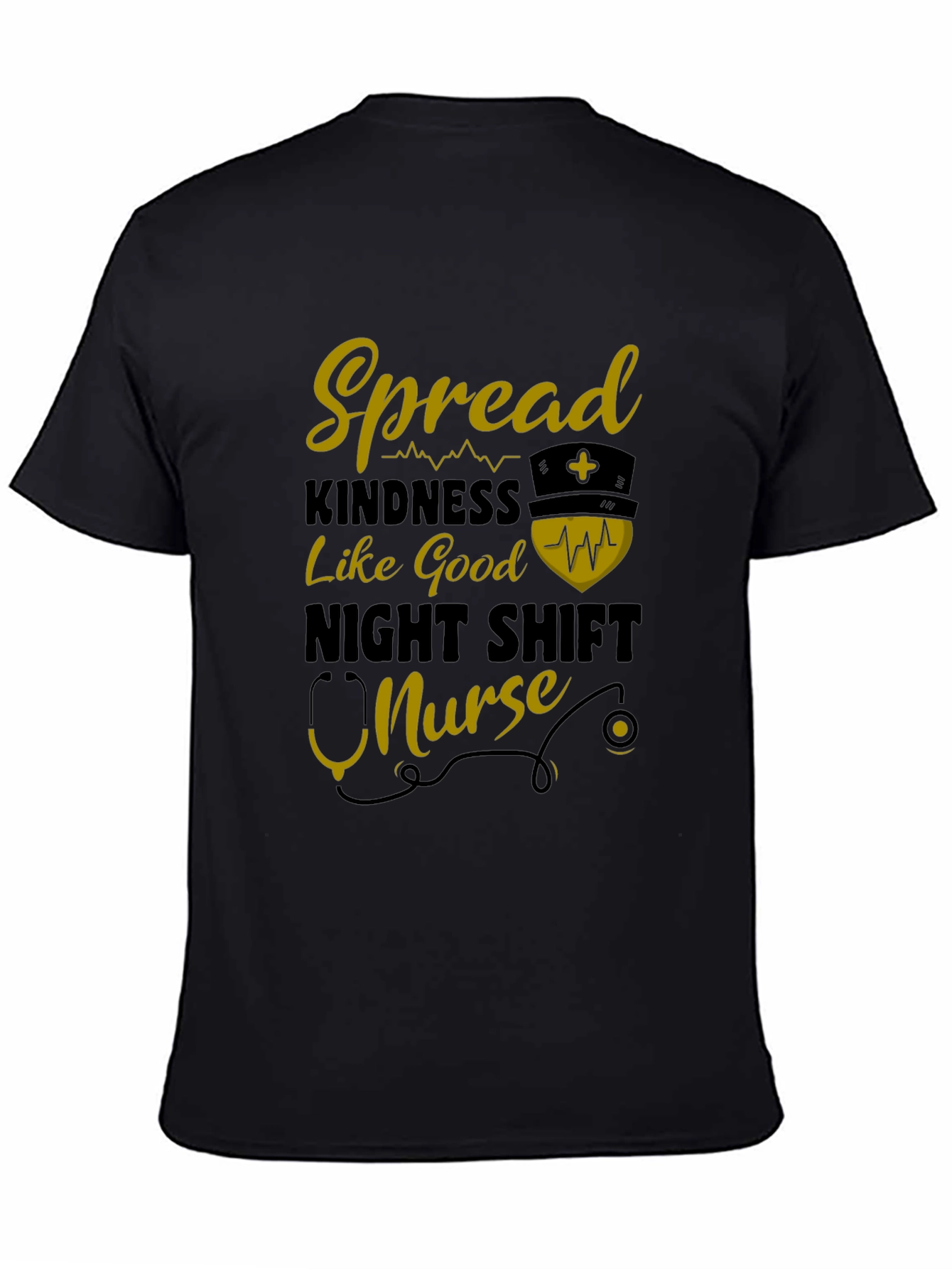 Show your appreciation for healthcare heroes with this stylish graphic t-shirt. The black tee features a gold-colored design with the phrase "Spread Kindness Like Good Night Shift Nurse" alongside imagery of a nurse's cap, a heart monitor waveform, and a stethoscope. This eye-catching design is perfect for nurses, healthcare professionals, or anyone who wants to promote kindness. The comfortable fabric makes it ideal for everyday wear, whether you're at work, running errands, or relaxing at home. Wear your heart on your sleeve and spread a positive message with this unique and meaningful tee.