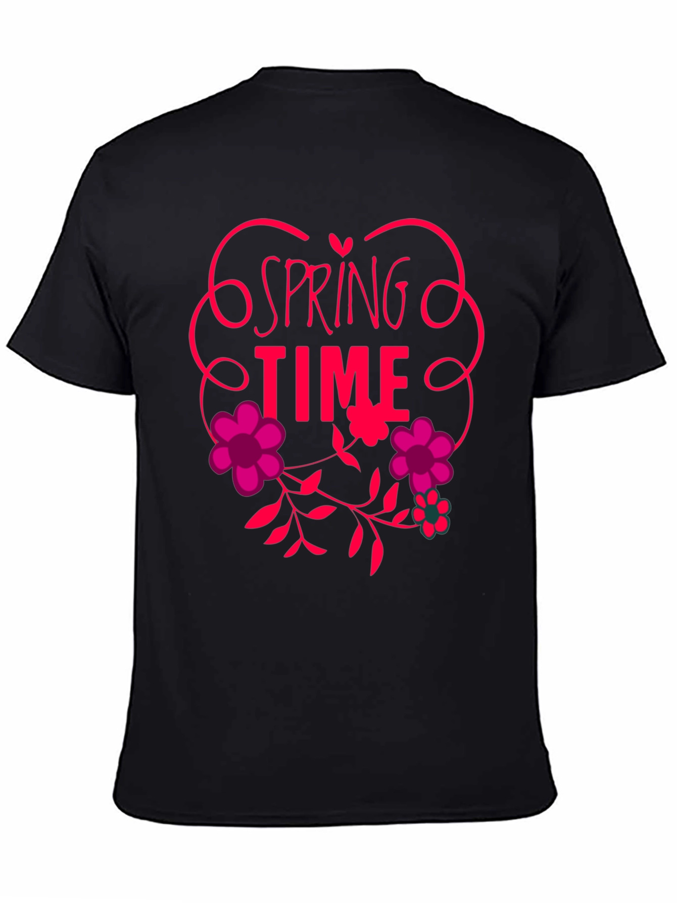 Embrace the season with this stylish black t-shirt featuring a vibrant "Spring Time" graphic design. The design incorporates playful pink floral accents and whimsical heart details, perfect for adding a touch of springtime cheer to your wardrobe. Made from a comfortable, breathable fabric, this tee is ideal for casual wear, outdoor activities, or simply lounging in style. Its eye-catching design makes it a great conversation starter. Pair it with jeans, shorts, or a skirt for a trendy and effortless look. A must-have for anyone who loves to celebrate the beauty of spring!