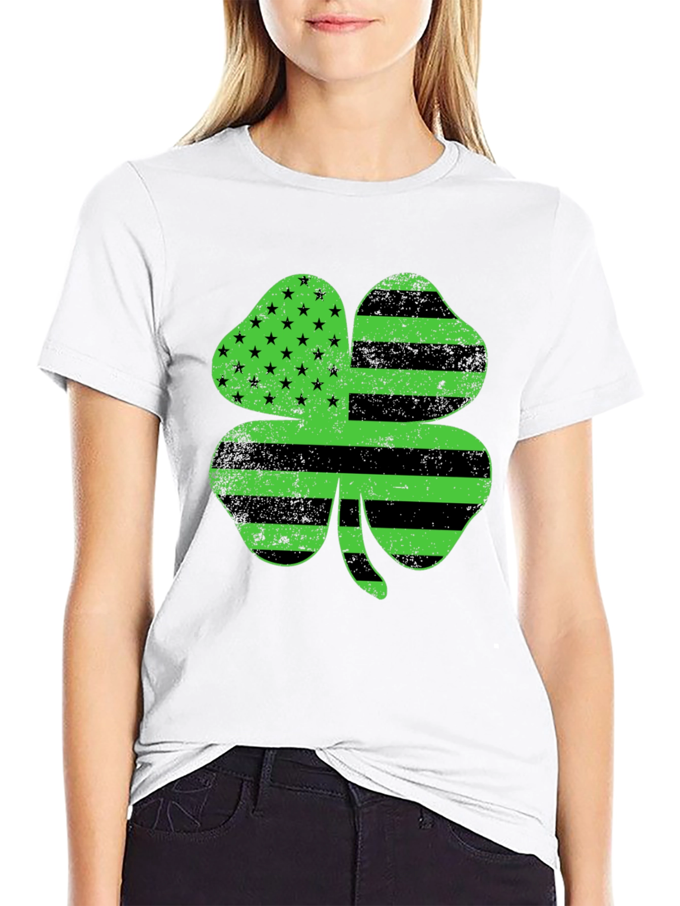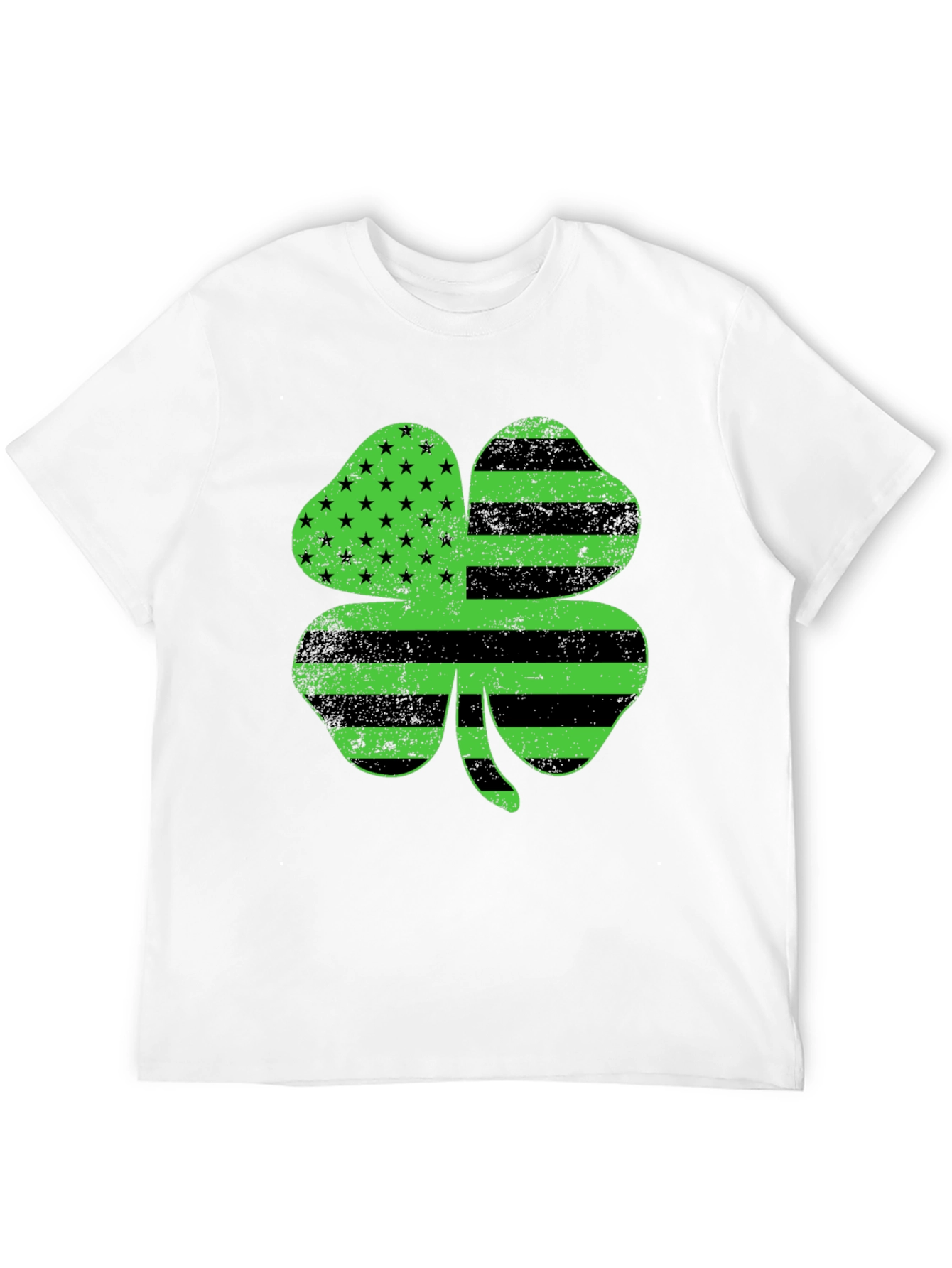 Show your Irish and American pride with this unique t-shirt! This eye-catching tee features a distressed-style shamrock design, combining the iconic four-leaf clover with elements of the American flag. Half of the clover displays stars, while the other half features bold stripes, all in a vibrant green hue. Made from a soft, comfortable fabric, this shirt is perfect for celebrating St. Patrick's Day, showing off your heritage, or simply adding a touch of patriotic flair to your everyday wardrobe. Get yours today!