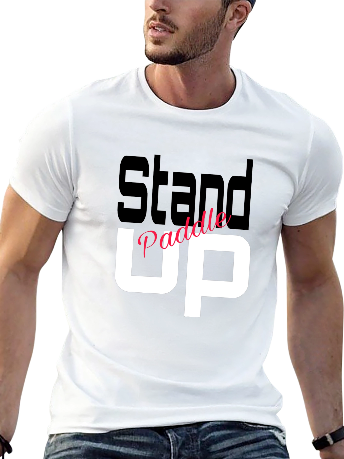 Show off your love for paddleboarding with this stylish black t-shirt. The shirt features the words "Stand Paddle Up" in a bold, eye-catching design, with "Stand" in dark gray, "Paddle" in pink, and "UP" in large white letters. Crafted from what appears to be soft and comfortable material, this tee is perfect for casual wear, beach outings, or showing off your passion for watersports. It's a great addition to any paddleboarder's wardrobe and makes a thoughtful gift. Get yours today and wear your love for the water!