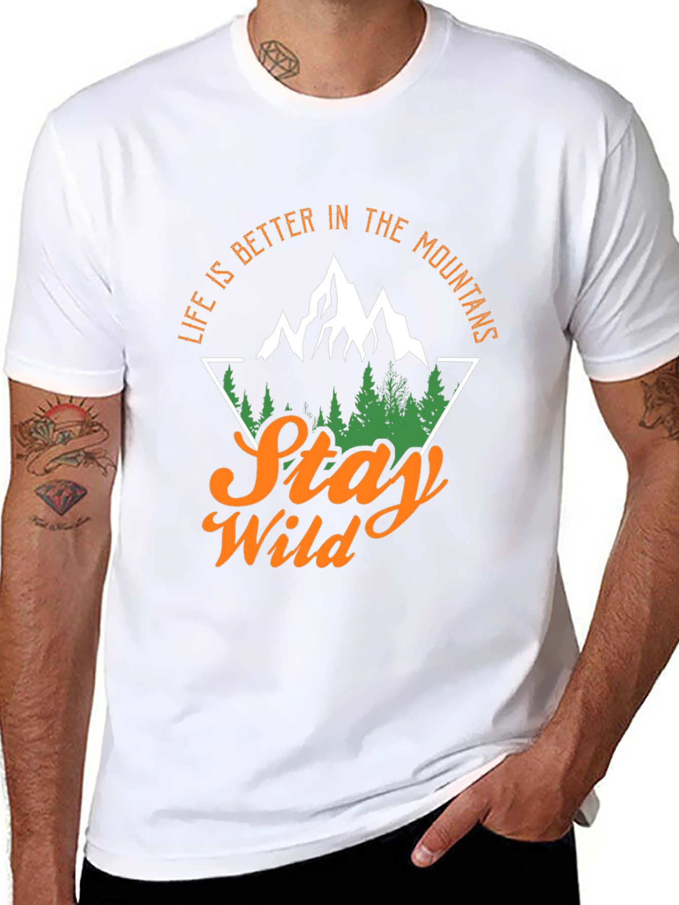 Embrace your adventurous spirit with this stylish black t-shirt. Featuring a unique graphic design with mountains and the words "Life is Better in the Mountains" and "Stay Wild", this tee is perfect for nature lovers and outdoor enthusiasts. The design incorporates a crisp white mountain range, and a bold orange script. Made from comfortable, breathable fabric, it's ideal for everyday wear, hiking, camping, or simply expressing your love for the great outdoors. Show off your wild side and inspire others to explore with this eye-catching tee!