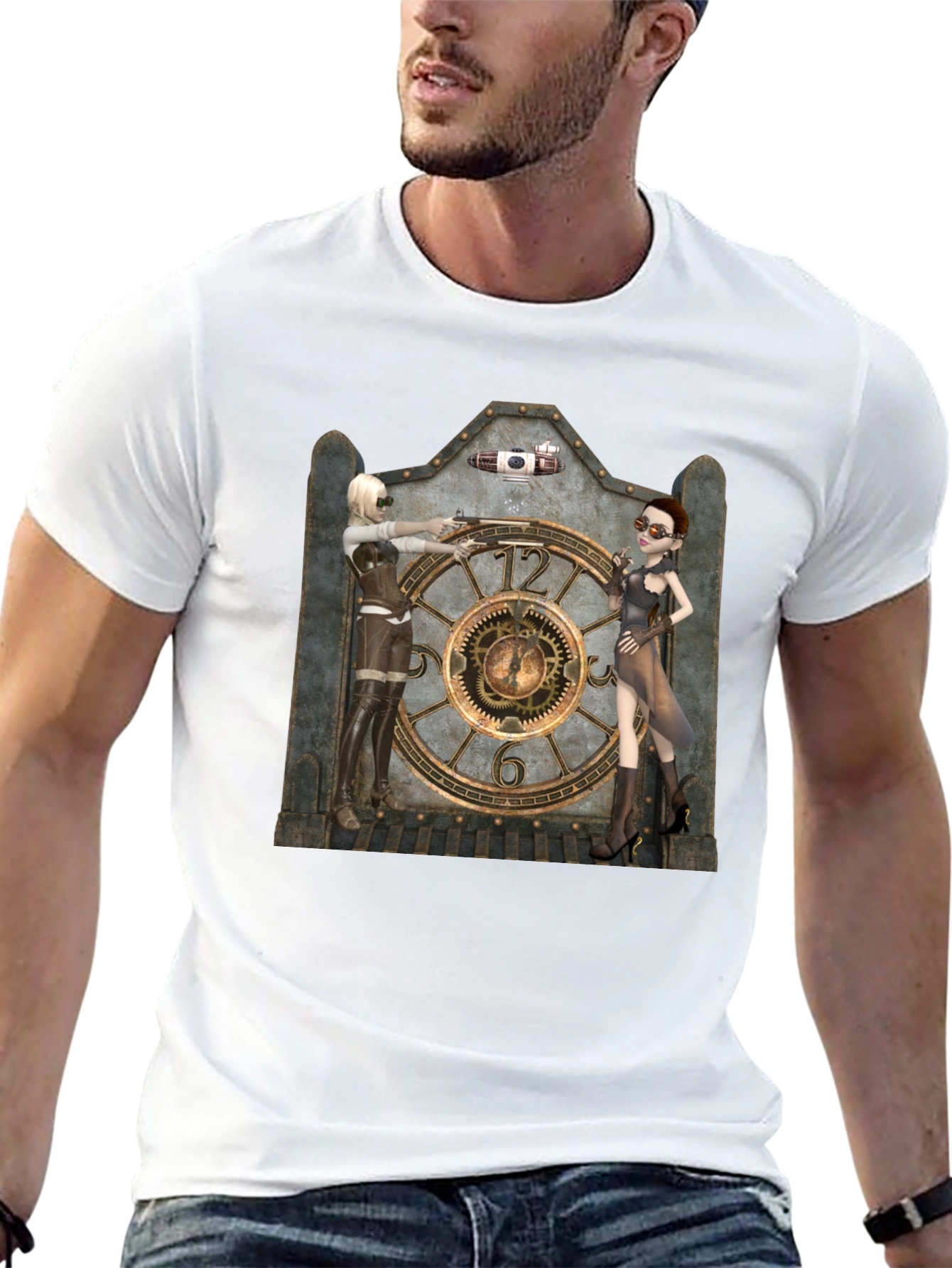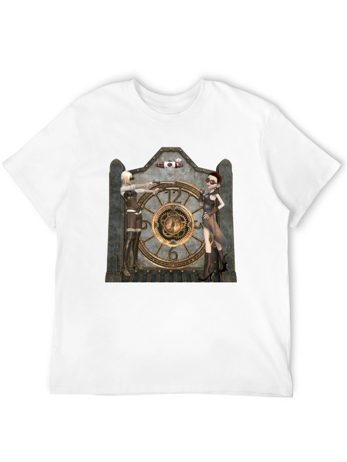 Show off your unique style with this eye-catching black t-shirt featuring a distinctive steampunk design. The centerpiece is a detailed clockwork illustration complete with gears, Roman numerals, and two figures in steampunk attire. The overall aesthetic evokes a sense of retro-futurism and mechanical artistry. Made from comfortable fabric, this t-shirt is perfect for casual wear, conventions, or as a statement piece. Makes a great gift for steampunk enthusiasts or anyone who appreciates unique fashion. Stand out from the crowd with this one-of-a-kind tee!