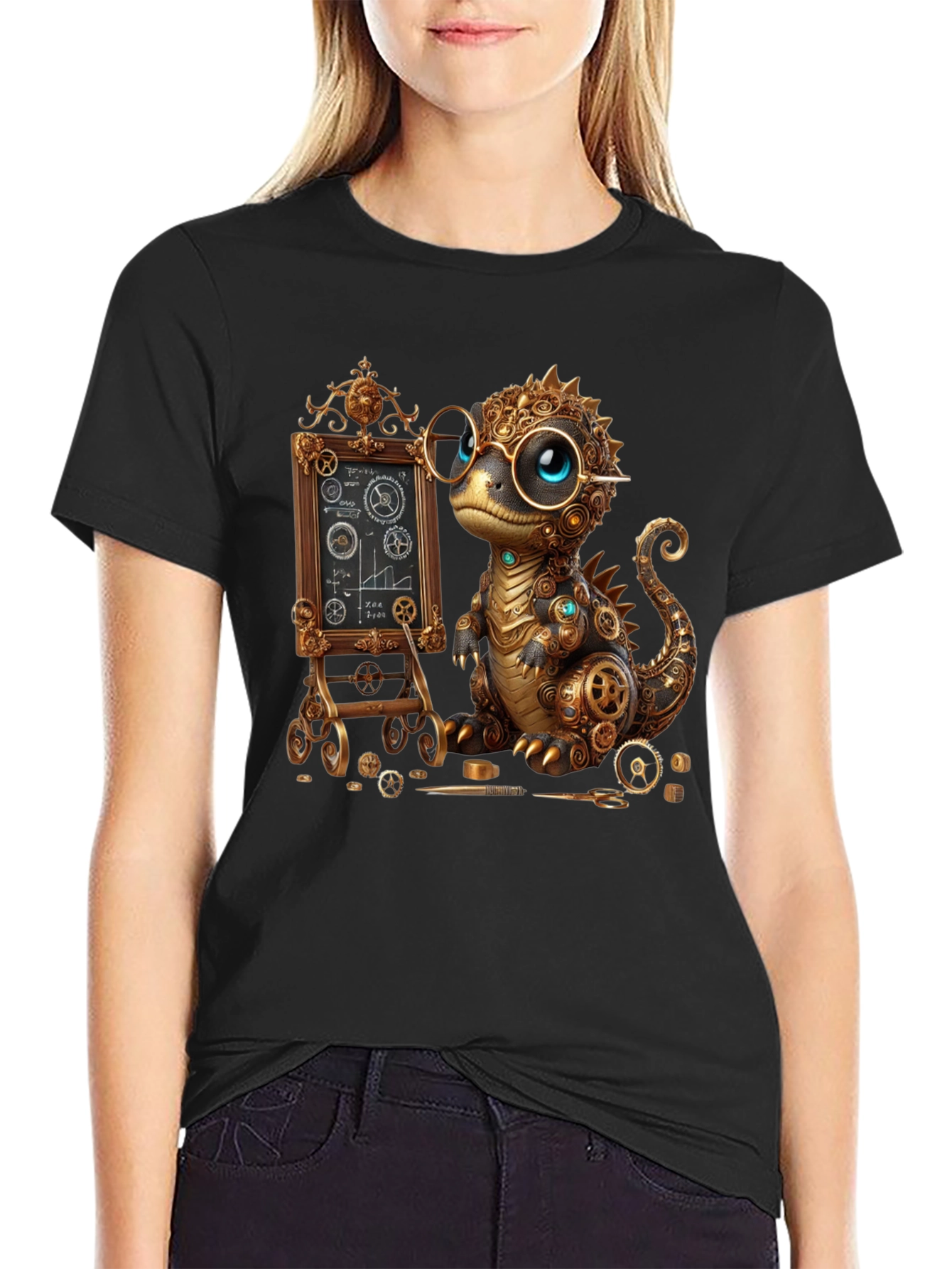 Show off your unique style with this eye-catching t-shirt! This black tee features a detailed graphic of a steampunk-style dinosaur, complete with gears, cogs, and round glasses. He's even next to a chalkboard, making him look like a scientist. The shirt appears to be made of a soft, comfortable material perfect for everyday wear. Great for casual outings, science enthusiasts, or anyone who loves whimsical designs. Makes a great gift!
