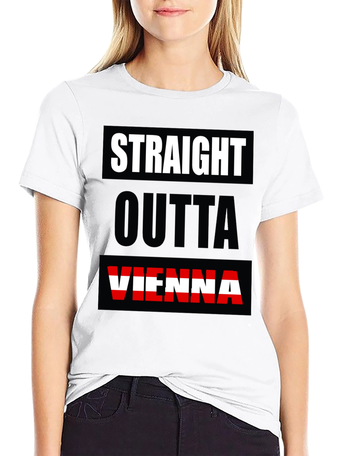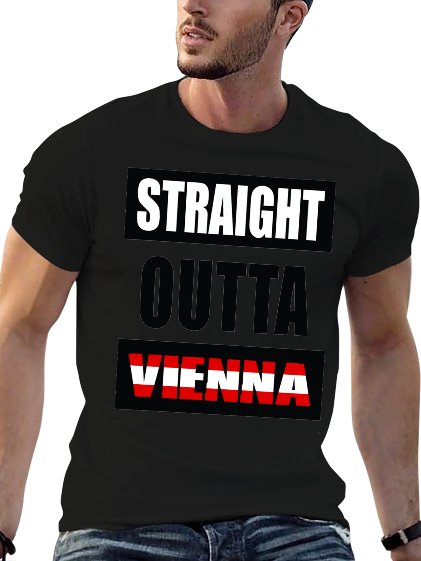 Show off your love for Vienna with this stylish black t-shirt. Made from comfortable, breathable fabric, this shirt features the bold statement "STRAIGHT OUTTA VIENNA" in a striking design. The word "STRAIGHT" is in white. "OUTTA" in gray. "VIENNA" is in red and white, like the Austrian flag. Perfect for casual wear, travel, or as a unique souvenir. Makes a great gift for friends, family, or anyone proud of their Vienna roots. Stand out with this trendy and eye-catching piece!