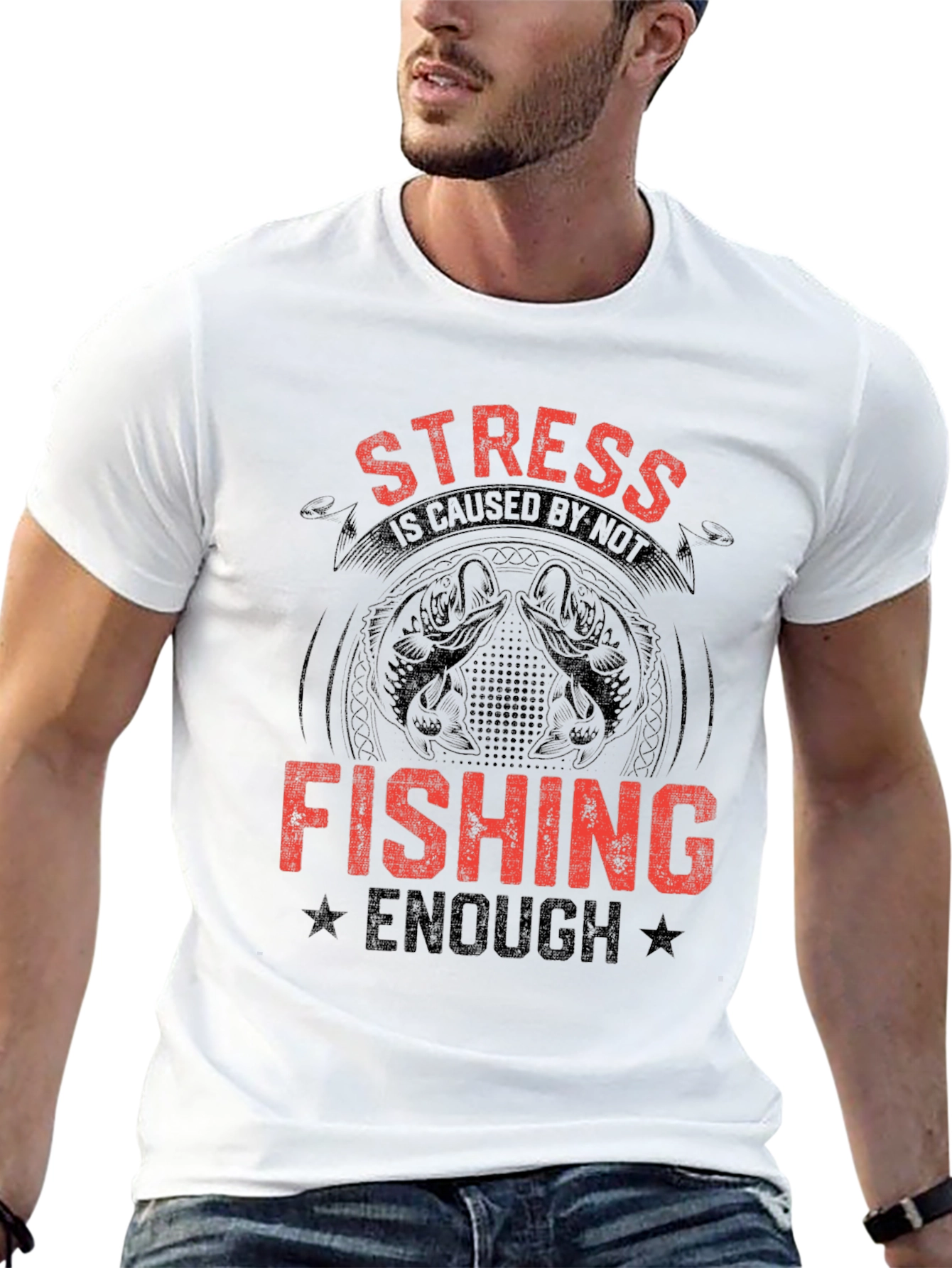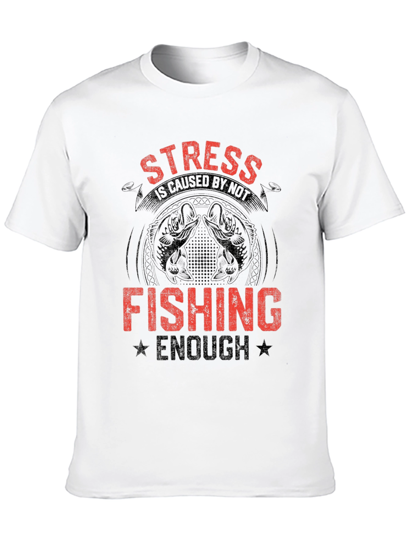 Show off your love for fishing with this stylish black graphic t-shirt. The shirt features a bold, distressed-style red print that reads, "STRESS IS CAUSED BY NOT FISHING ENOUGH". This tee is perfect for casual wear, fishing trips, or as a gift for the avid angler in your life. This classic fit tee is sure to become a wardrobe staple for any fishing enthusiast. Add a touch of fun to your everyday style while expressing your passion for the sport.
