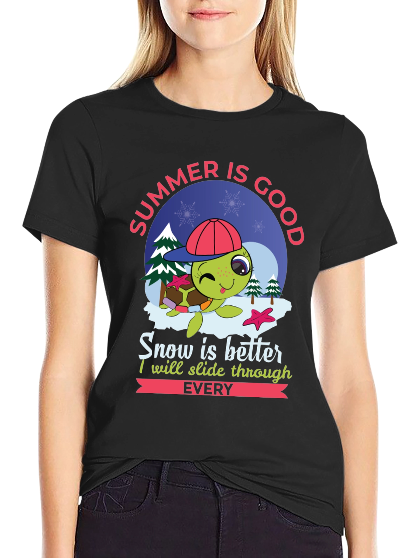 This eye-catching black t-shirt features a whimsical design of a cute cartoon turtle wearing a backwards red cap. Set against a snowy backdrop, the graphic playfully declares "Summer is Good, Snow is Better. I will slide through EVERY." This tee is perfect for those who love lighthearted humor and a blend of seasons. Made from a comfortable fabric, it's an ideal choice for casual wear, vacations, or as a fun conversation starter. Show off your unique style with this vibrant and comfortable turtle tee!
