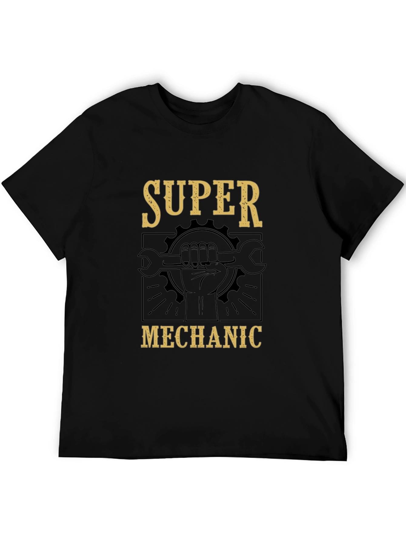 Show off your skills with this Super Mechanic T-Shirt! This black tee features a bold graphic design with 'SUPER' and 'MECHANIC' emblazoned above and below an image of a hand holding a wrench against a gear backdrop. The vintage-style text adds a touch of timeless appeal. Made from comfortable, breathable fabric, this t-shirt is perfect for everyday wear, whether you're working in the shop, attending a car show, or just relaxing at home. A great gift for any automotive enthusiast or professional mechanic.