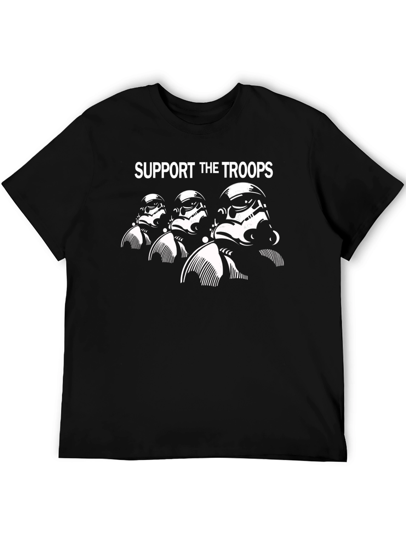 Show your support with this bold black t-shirt featuring a striking design of three stormtroopers and the powerful message "Support the Troops." This shirt is made from a comfortable-looking fabric. The monochromatic graphic pops against the dark background, making it a standout piece. This t-shirt is perfect for casual outings, Star Wars fans, or anyone looking to make a statement. Wear it to the movies, comic con, or just hanging out with friends.
