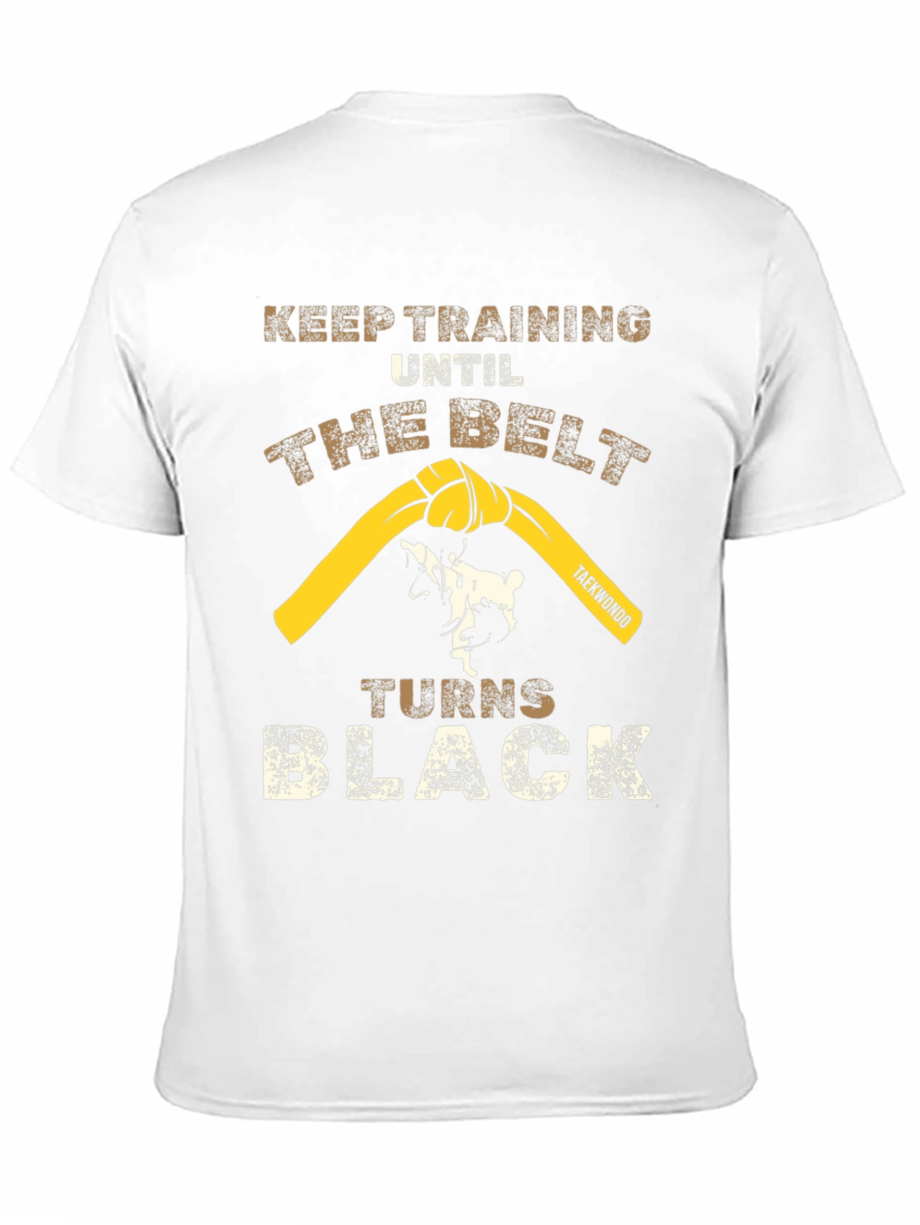 Show your dedication to Taekwondo with this unique t-shirt! The design features a yellow belt graphic with the words 'Keep Training Until the Belt Turns Black,' a motivational message for martial arts enthusiasts. Made from a comfortable fabric, this black tee is perfect for training sessions, casual wear, or showing off your passion for Taekwondo. A great gift for martial artists of all levels. The text has a distressed effect for a vintage look.
