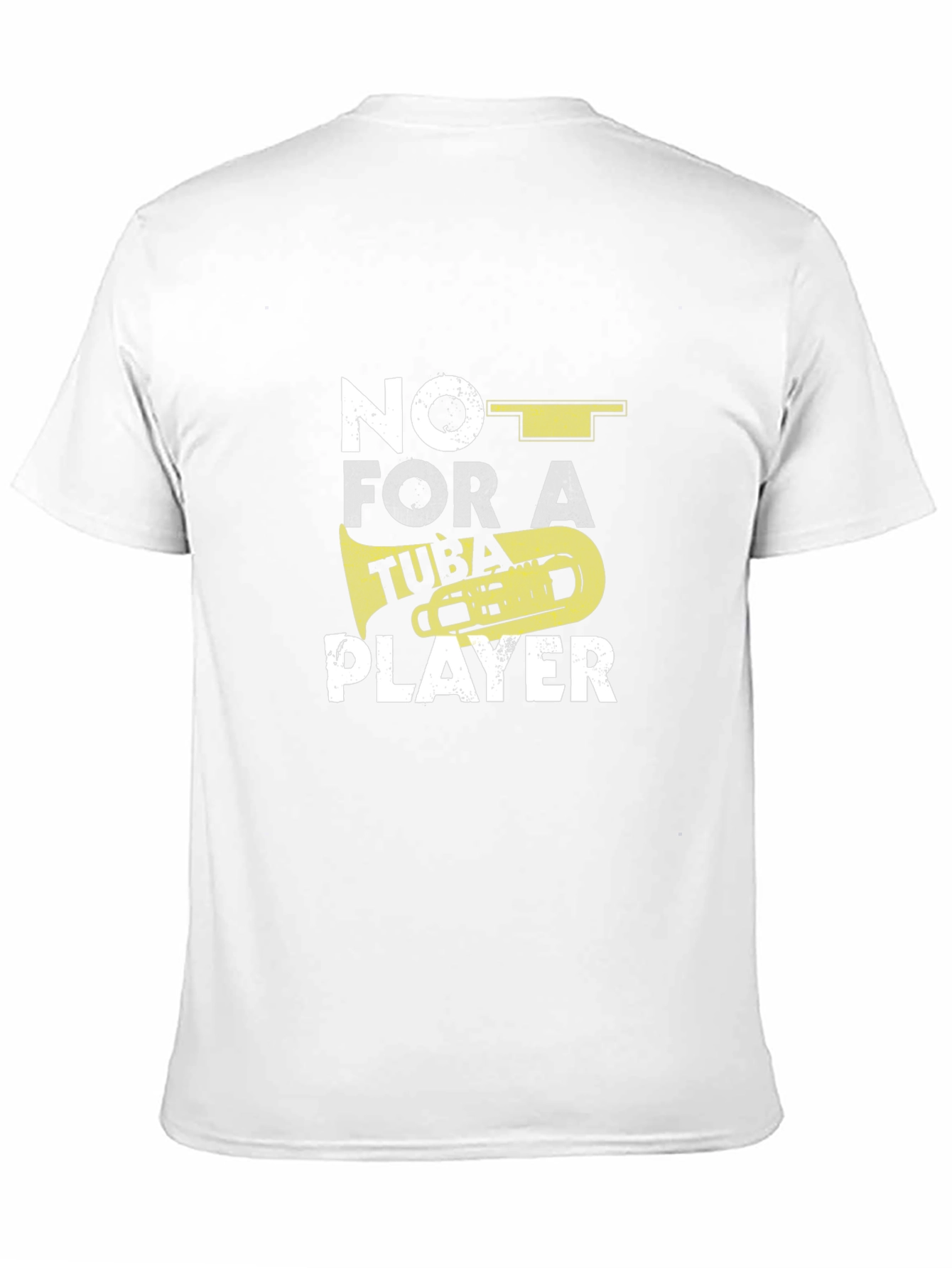Show off your love for music and a good laugh with this unique graphic t-shirt! The shirt features a playful design with the words "NO" "FOR A" "TUBA" "PLAYER" incorporating a tuba illustration in an olive green hue. The design is printed on a classic black t-shirt, perfect for everyday wear. Made from a comfortable fabric, this tee is ideal for musicians, band members, or anyone with a sense of humor. Wear it to rehearsals, concerts, or casual outings to express your musical personality. A great gift for the tuba player in your life!