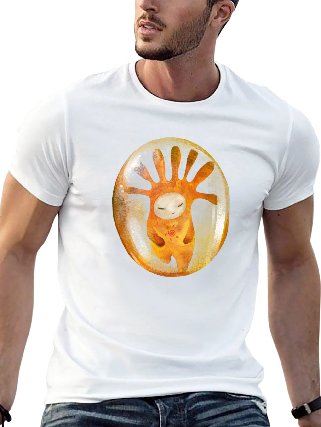 Elevate your casual style with this distinctive black t-shirt featuring a captivating graphic design. A whimsical, golden character with closed eyes and sun symbol is encased in a sparkling, translucent orange-yellow bubble. This artwork offers a touch of peacefulness and creativity to your wardrobe. The shirt appears to be made of a soft, comfortable fabric, perfect for everyday wear. Ideal for those who appreciate unique art and want to express their individuality, this tee makes a statement. Whether you are lounging at home or going out with friends, this t-shirt combines comfort with eye-catching design. Add a touch of artistic flair to your look with this must-have piece.