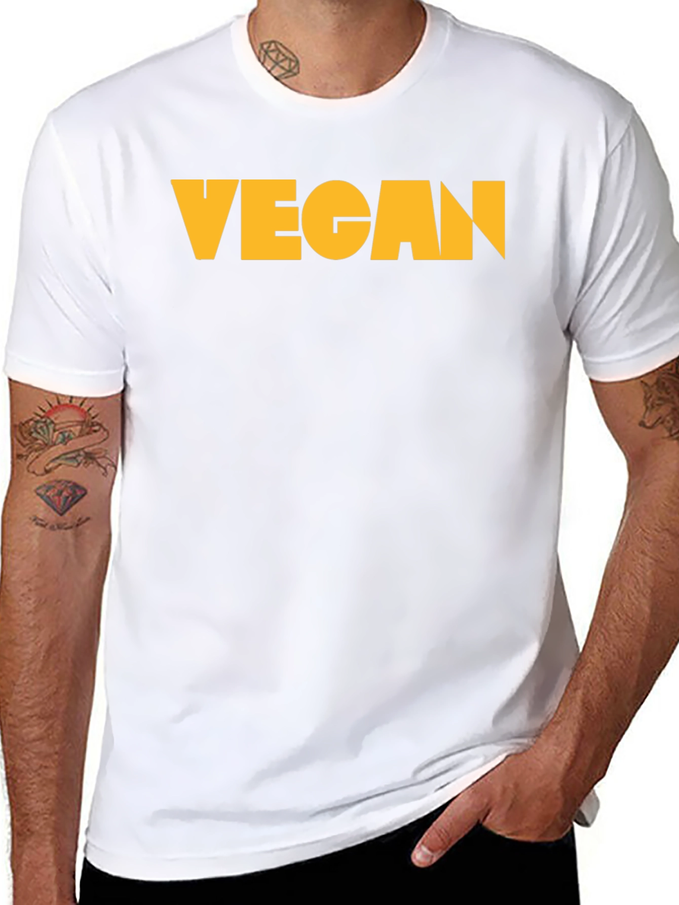 Declare your lifestyle with this bold vegan t-shirt. The shirt features the word "VEGAN" in a vibrant gold, block-style font across the chest. Made from a soft, comfortable material, this classic fit tee is perfect for everyday wear. Its simple design makes it a versatile addition to any wardrobe, ideal for casual outings, rallies, or simply expressing your values. Show the world your commitment to plant-based living with this statement piece. This vegan tee combines comfort, style, and a strong message.