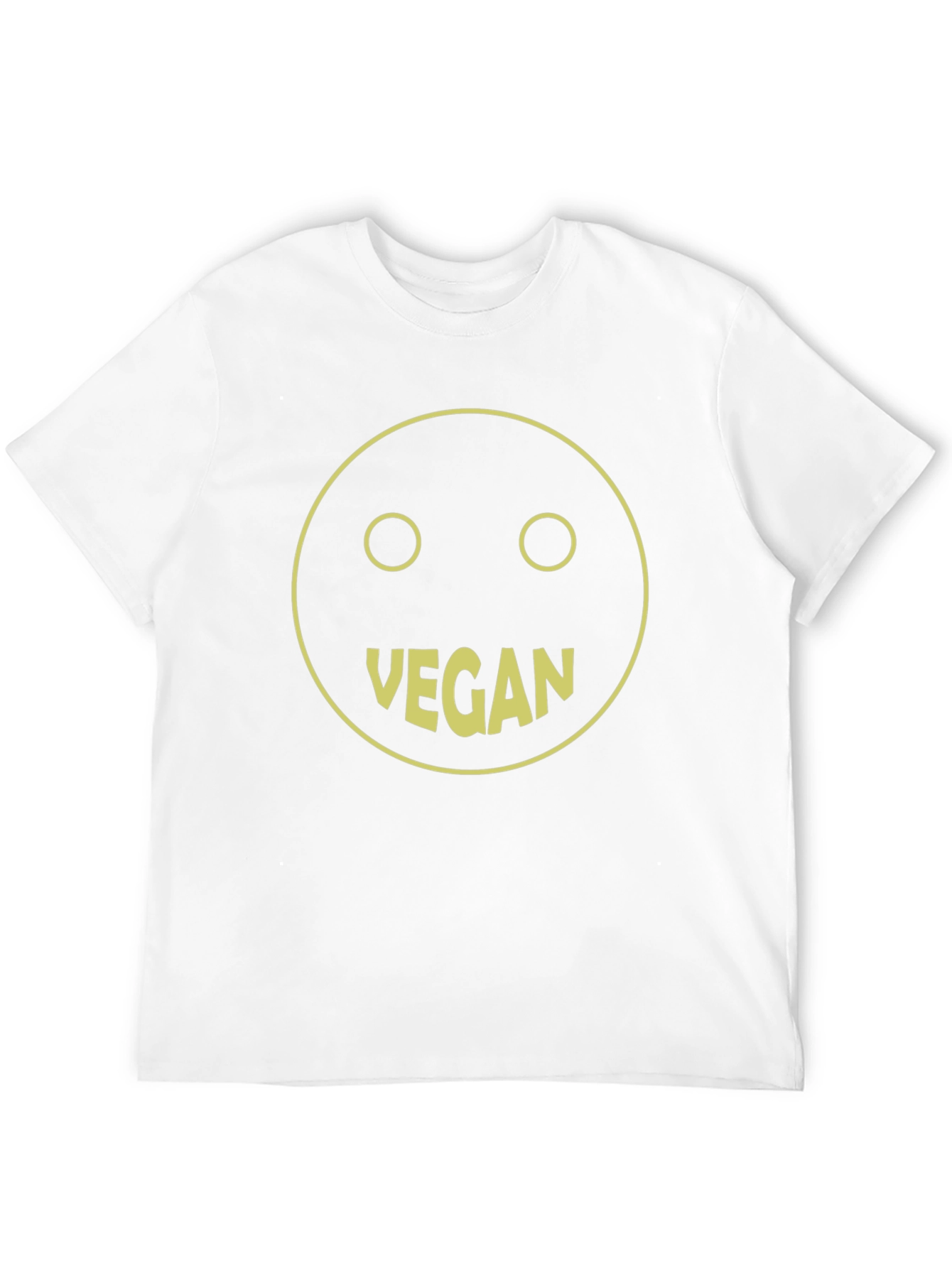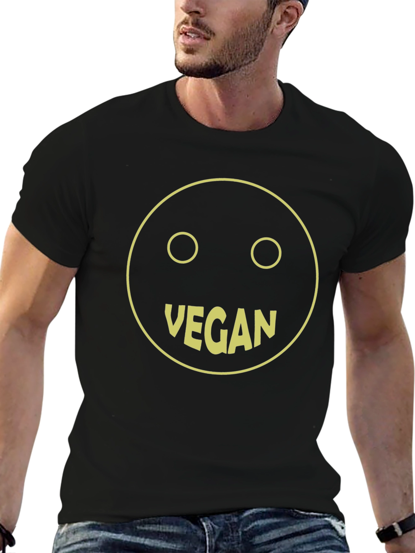 Show your vegan pride with this stylish black t-shirt. The shirt features a minimalist smiley face design in yellow, with the word "VEGAN" forming the mouth. This unique graphic tee is perfect for everyday wear, casual outings, or to make a statement at vegan events. Made from a comfortable fabric blend, this t-shirt offers a soft feel and a relaxed fit. Ideal for showcasing your commitment to a plant-based lifestyle with a touch of humor and style. Add this standout piece to your wardrobe and spread the vegan message wherever you go!