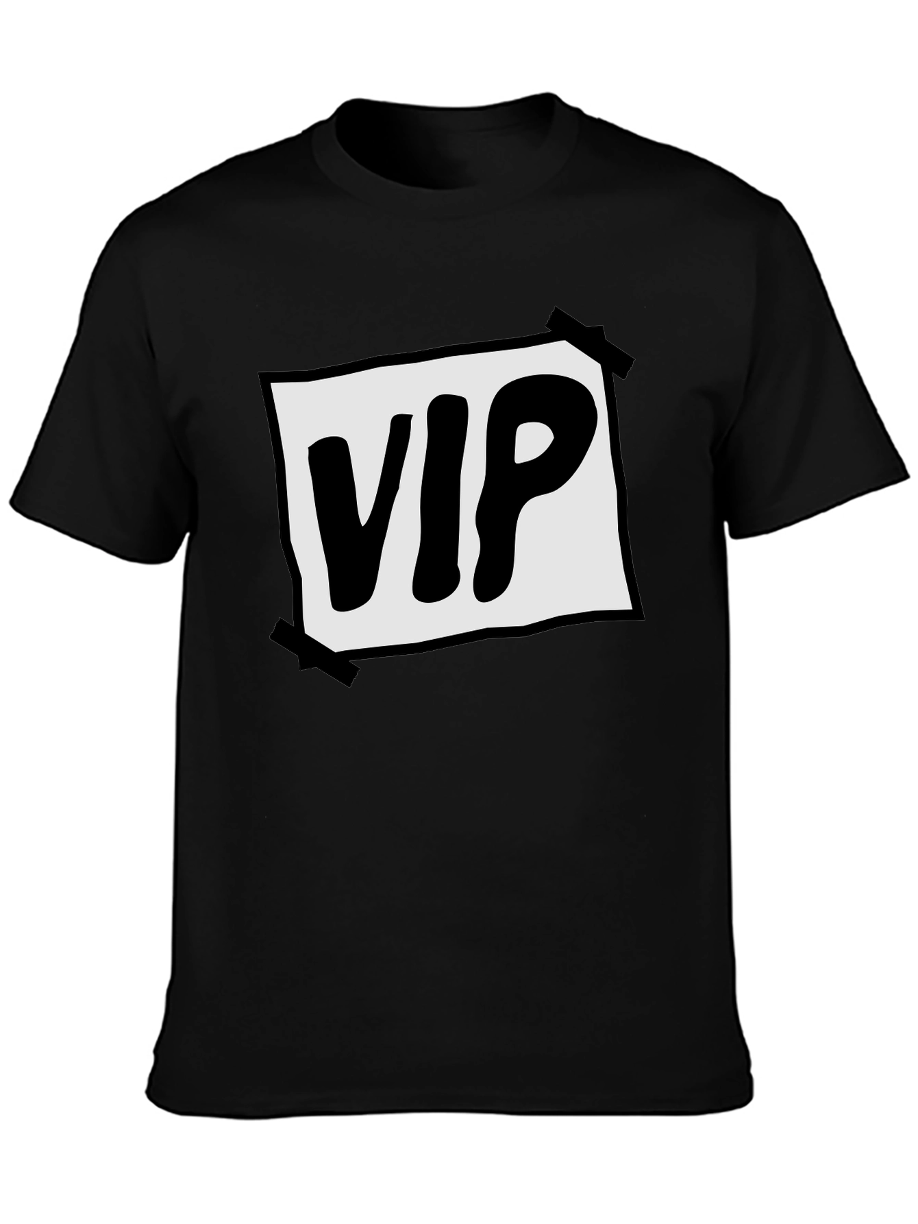 Show off your VIP status with this eye-catching black t-shirt. The design features a bold 'VIP' graphic in a white rectangle, creating a striking contrast. The image is taped on and gives a creative edge to your casual wear. Made from a comfortable-looking fabric, this shirt is perfect for everyday wear, concerts, or any event where you want to stand out. Pair it with jeans, shorts, or joggers for a relaxed yet stylish look. Get ready to turn heads and let everyone know you're the VIP!