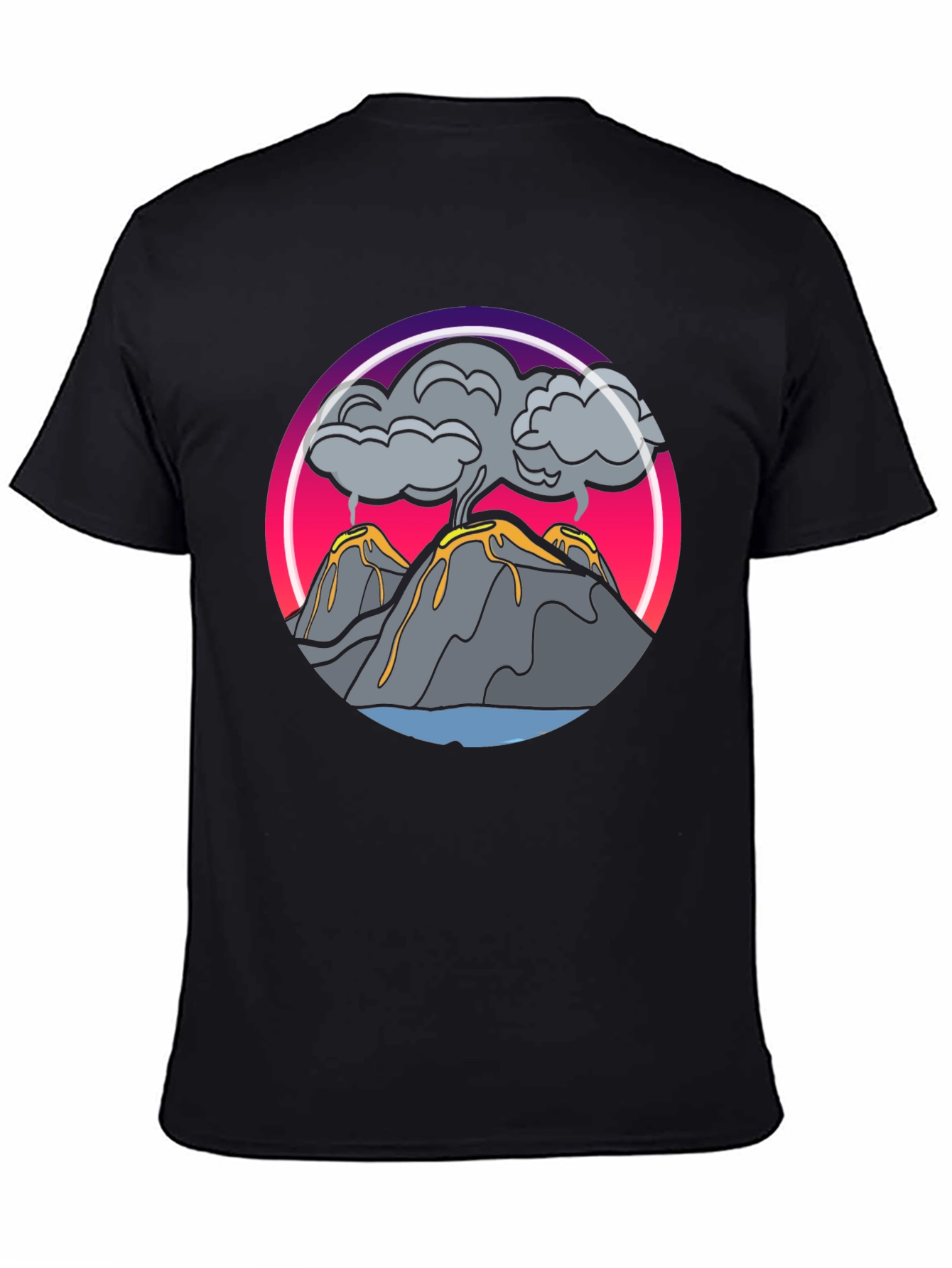 Unleash your adventurous side with this eye-catching black graphic tee. The shirt features a vivid volcano eruption design, complete with flowing lava and billowing smoke clouds, all encased within a retro-inspired circle. The design offers a unique blend of nature and style, making it a standout piece in any wardrobe. Made from comfortable, breathable fabric, this tee is perfect for casual outings, concerts, or just lounging around. Let your style erupt with this must-have graphic tee!