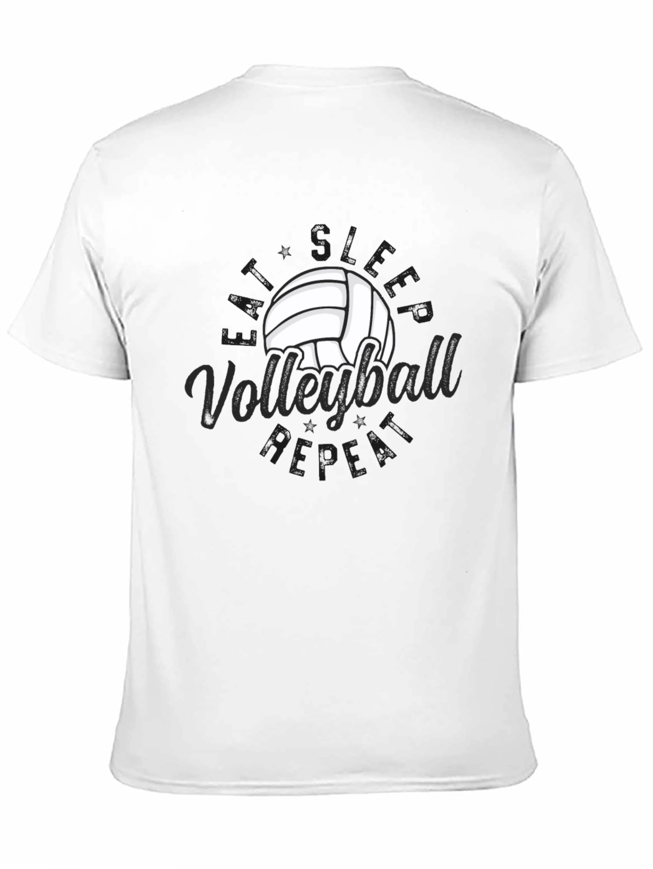 This black t-shirt features a stylish volleyball graphic design. The design includes a classic volleyball illustration and the words "Volleyball Repeat" in a circular layout. Made from comfortable materials, this shirt is perfect for volleyball players, fans, or anyone who loves the sport. The design is subtle yet eye-catching, making it a great casual wear option. Ideal for wearing to volleyball games, practices, or everyday outings to showcase your passion for the sport. This t-shirt is a must-have for volleyball enthusiasts.