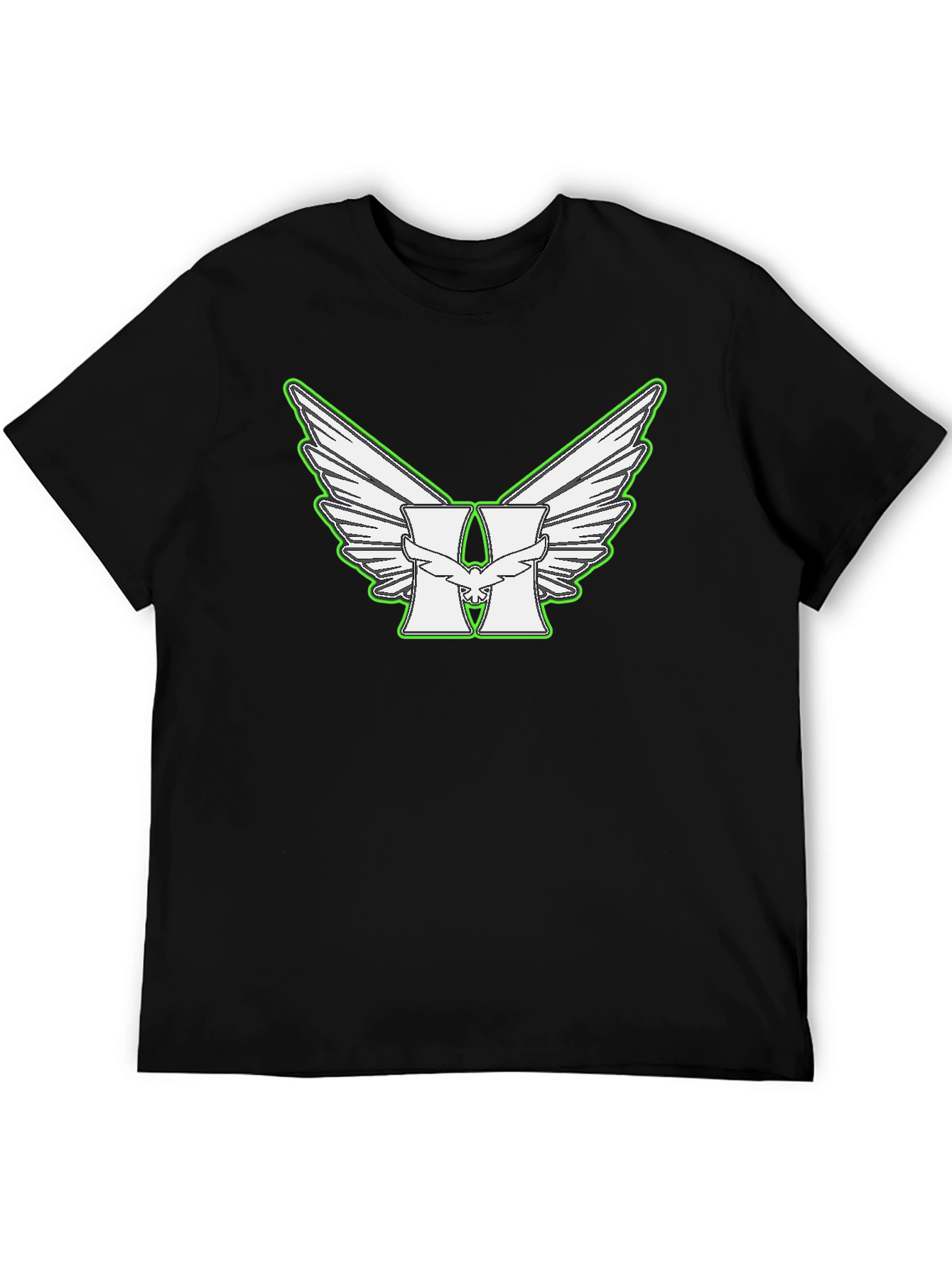 This black t-shirt features a striking graphic print of stylized wings paired with an "H" logo. The design incorporates white wings outlined with a vivid green trim, creating a bold contrast against the dark fabric. A small, white bird is prominently placed in the center of the “H”. Crafted from comfortable, breathable fabric, this shirt is ideal for casual wear. The classic cut makes it suitable for a variety of body types. Wear it for a casual, everyday look. The unique logo also makes it a statement piece that allows the wearer to show off their style.
