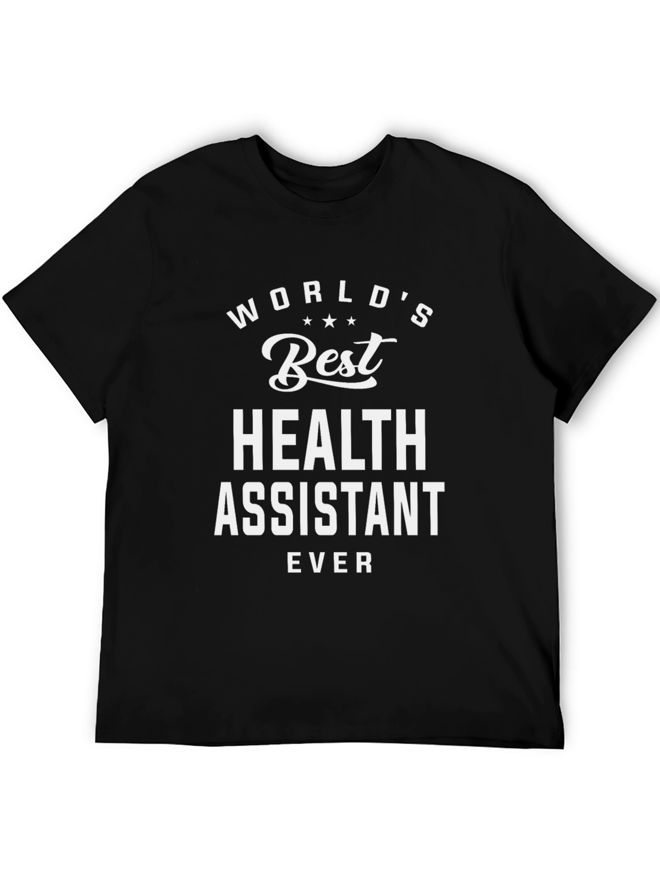 Show your appreciation with this stylish black t-shirt! Featuring a bold, white graphic print that reads "World's Best Health Assistant Ever," this tee is perfect for everyday wear. The design includes decorative stars and script lettering, adding a touch of flair. Made from a soft, comfortable fabric, it's ideal for healthcare professionals or anyone who wants to show support for health assistants. A great gift or a fun way to celebrate the hardworking health assistants in your life! Perfect for casual occasions, work events, or simply lounging around in style.