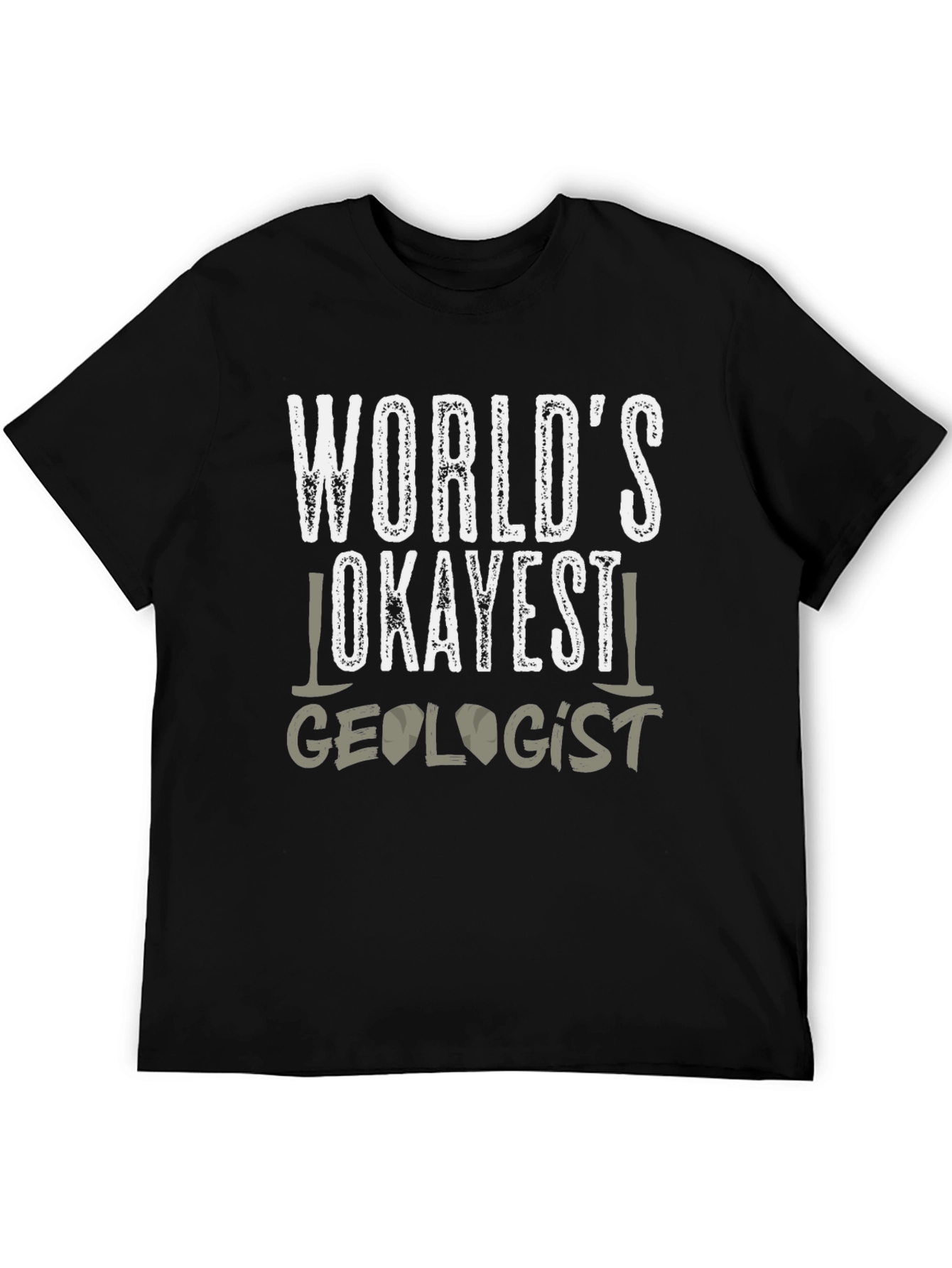 This black t-shirt features a humorous graphic design perfect for any geologist with a sense of humor. The text "WORLD'S OKAYEST GEOLOGIST" is displayed in white and gray, with two geology hammers flanking the word "OKAYEST". Made from a comfortable-looking fabric, this tee offers a relaxed fit suitable for everyday wear. Ideal for casual outings, geology conferences, or as a quirky gift for the geologist in your life. Show off your passion for rocks and minerals with this fun and eye-catching t-shirt!