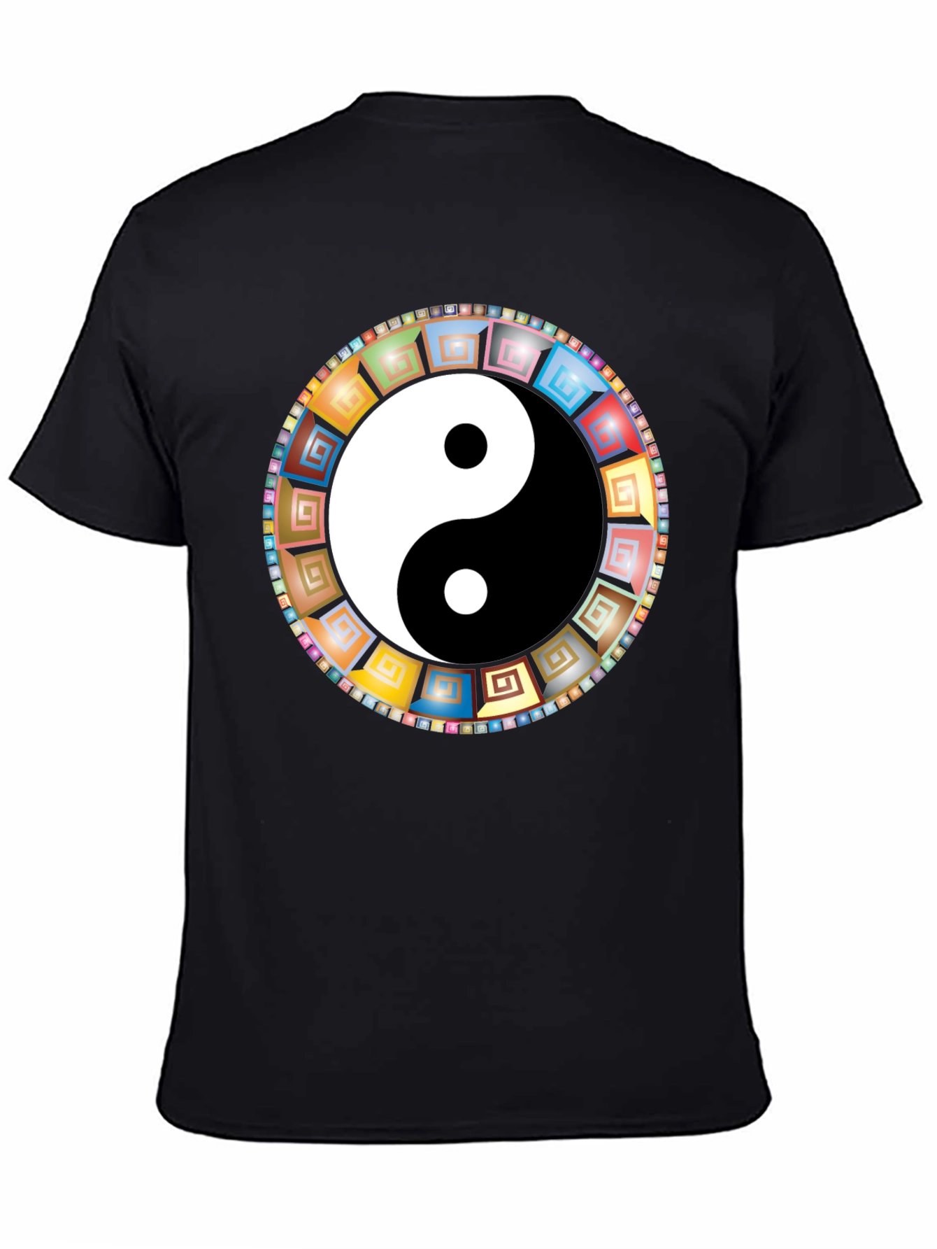 Elevate your style with this captivating black tee featuring a vibrant Yin Yang mandala design. The classic yin yang symbol is encircled by a mosaic of geometric squares, creating a mesmerizing visual effect. Made from soft, breathable cotton, this tee offers both comfort and style. Perfect for casual wear, yoga sessions, or expressing your unique personality. Stand out from the crowd with this eye-catching graphic tee that embodies balance and harmony. Great as a gift or as a trendy piece for your wardrobe. Machine washable for easy care.